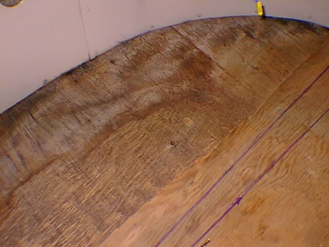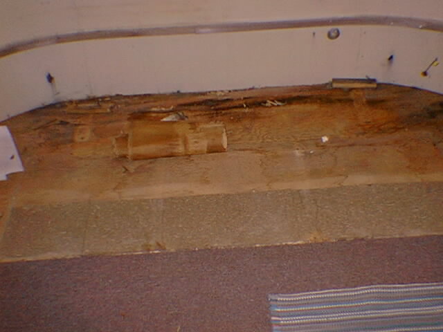 the trailer. So I ripped out all the wood from the door opening forward. I also removed the interior walls for easy access to the the bolts that hold the aluminum frame to the edge of the wood floor. Note the close up of the old bolt still in the