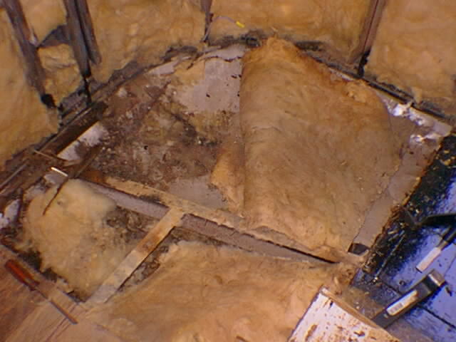channel. The wood was removed from this bolt w/o cutting the bolt first. This wood was real soft. I took out the old fiberglass and painted the exposed frame with POR15. I then installed new insulation and a new plywood floor in two pieces so as the fit